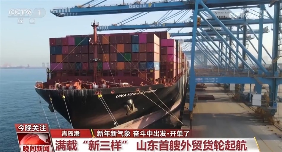 新年伊始,山東首艘外貿(mào)貨輪從青島港起航。3500多個標箱里滿載包括電動載人汽車、鋰離子蓄電池、太陽能電池等外貿(mào)“新三樣”,總貨值約2億人民幣。