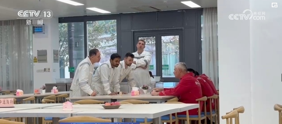 一輛輛各式各樣的自行車平穩(wěn)穿梭在安全區(qū),車上的工友有事兒就會互相召喚,拿出圖紙解決問題,互通有無。而在職工和船東餐廳里,一張張餐桌上分區(qū)標記了各個業(yè)主單位。吃完飯撤掉餐具,大家就開始“頭腦風暴”,現(xiàn)場辦公。