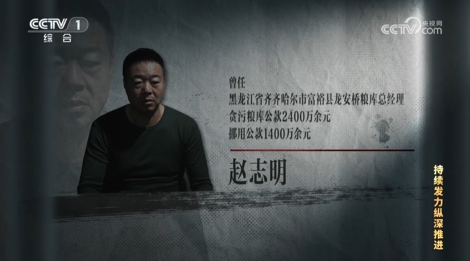 【解說(shuō)詞】趙志明曾是黑龍江省齊齊哈爾市富??h龍安橋糧庫(kù)總經(jīng)理,經(jīng)查,他貪污糧庫(kù)公款2400萬(wàn)余元,挪用公款1400萬(wàn)余元,2023年3月被判處有期徒刑14年。龍安橋糧庫(kù)是在2015年由5家國(guó)有糧庫(kù)改革重組的,富裕縣政府持股51%、民營(yíng)企業(yè)鼎倉(cāng)公司持股49%。趙志明原本是鼎倉(cāng)公司的老板,在這次改制中當(dāng)上了龍安橋糧庫(kù)總經(jīng)理。