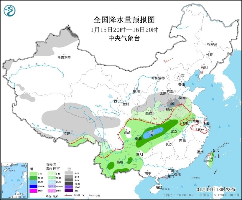1月14日20時至15日20時,新疆北疆西北部、西藏東部、甘肅東部、陜西、山西南部、河南等地的部分地區(qū)有小到中雪,其中新疆阿勒泰、陜西南部、河南西部等地的部分地區(qū)有大雪,局地暴雪(10~12毫米),陜西南部、湖北西北部局地有凍雨;西南地區(qū)東部、江漢中西部、江南西部和東北部、廣西西部和北部、云南南部、海南島等地有小到中雨,其中重慶中北部等地局地有大雨(25~35毫米)。山東半島、江南東北部、西藏等地的部分地區(qū)有4~6級風(fēng),其中浙江東部沿海、西藏中部的部分地區(qū)風(fēng)力可達(dá)7級以上(見圖1);臺灣海峽有7~8級、陣風(fēng)9級的東北風(fēng),黃海、東海大部、南海中北部和西南部有5~7級風(fēng),陣風(fēng)8級。