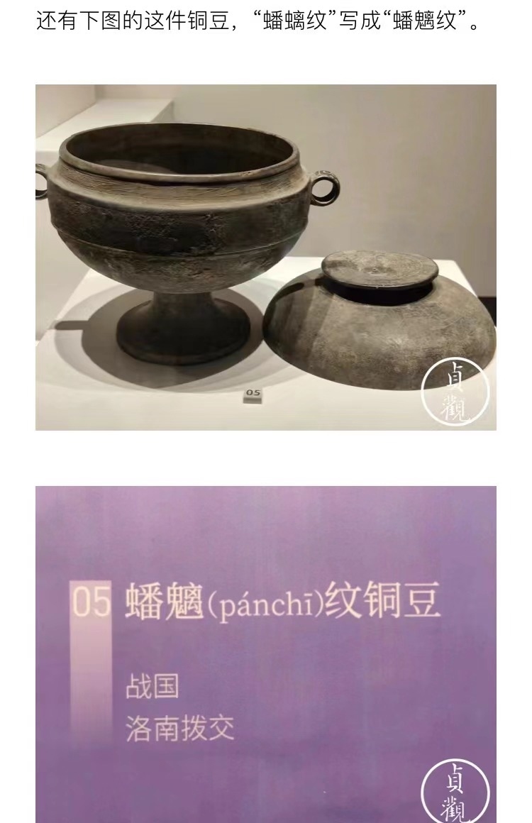 文章稱,秦漢館中很多展品不僅沒有英文標識,甚至連展品的基本信息都不全,有的文物名稱也被標錯,如:“鷹獸相搏紋飾銅牌飾” 被誤寫為“銅鷹獸權(quán)博牌飾”;介紹一件銅豆的展品信息中,“蟠螭紋”誤寫成“蟠魑紋”。