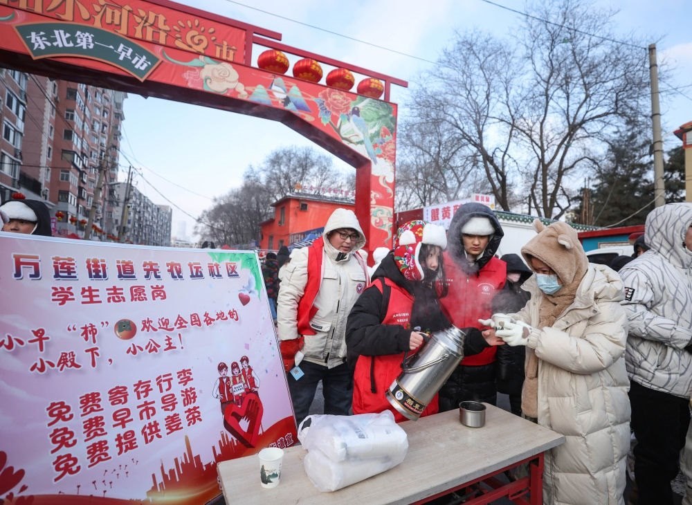 ?2024年1月21日,在遼寧沈陽(yáng)小河沿早市,志愿者為游客提供免費(fèi)熱水。新華社記者 龍雷 攝