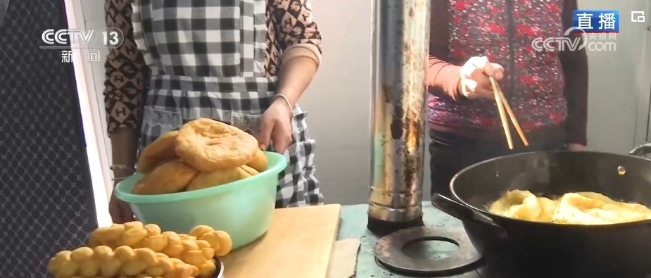 炸年饃是當(dāng)?shù)赝磷迦罕娪哟汗?jié)的傳統(tǒng)習(xí)俗。一家人齊上陣,這邊兩位大姐正在將發(fā)好的面揉好、揪出面劑子、搟成圓形、表面抹上清油,放進(jìn)油鍋里炸熟。對(duì)于土族群眾來(lái)說(shuō),進(jìn)入臘月之后就開(kāi)始做年饃、宰年豬、置辦年貨,年味兒就濃了。炸年饃是當(dāng)?shù)厝罕娖碓感碌囊荒觑L(fēng)調(diào)雨順、五谷豐登、平安順?biāo)斓拿篮迷⒁?。制作年饃的面粉、菜籽油等材料都是政府給受災(zāi)群眾提供的物資。