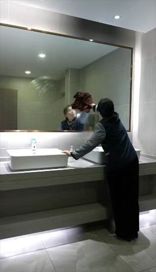 王柳云的保潔面積很大,整個(gè)寫字樓的十五層和十七層,地板、桌椅、窗戶、衛(wèi)生間,都是她的職責(zé)范圍?!昂芏嗳艘婚_完會(huì),杯子、椅子、桌子要清理,還有窗子全部要擦干凈”,她形容自己的工作量“三四個(gè)人都干不完”,但她看中了這份工作留給她的一隅,隨便找個(gè)角落就可以寫字畫畫。