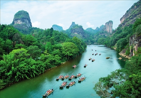 游客在福建省武夷山國家公園九曲溪乘船游覽(2023年10月3日攝)。陳穎攝/本刊