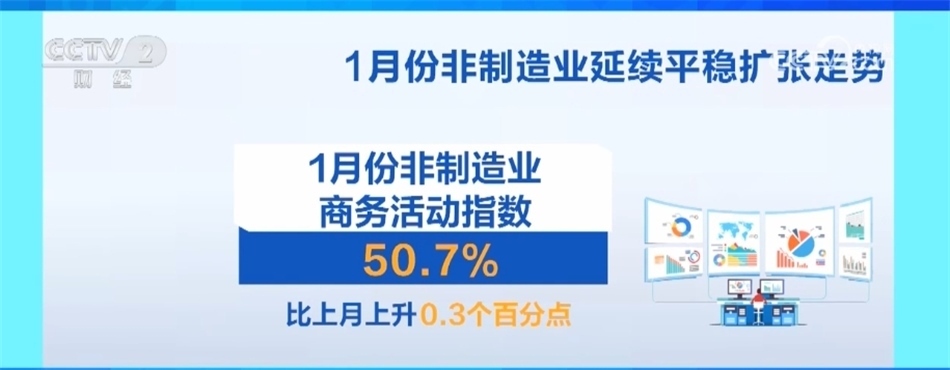 此外,1月份非制造業(yè)商務活動指數(shù)為50.7%,比上月上升0.3個百分點,延續(xù)平穩(wěn)擴張走勢。其中,服務業(yè)商務活動指數(shù)升至擴張區(qū)間,景氣面也有所擴大。在節(jié)日效應帶動下,零售、道路運輸、餐飲等行業(yè)商務活動指數(shù)升至擴張區(qū)間。郵政、貨幣金融服務等行業(yè)業(yè)務量增長較快。