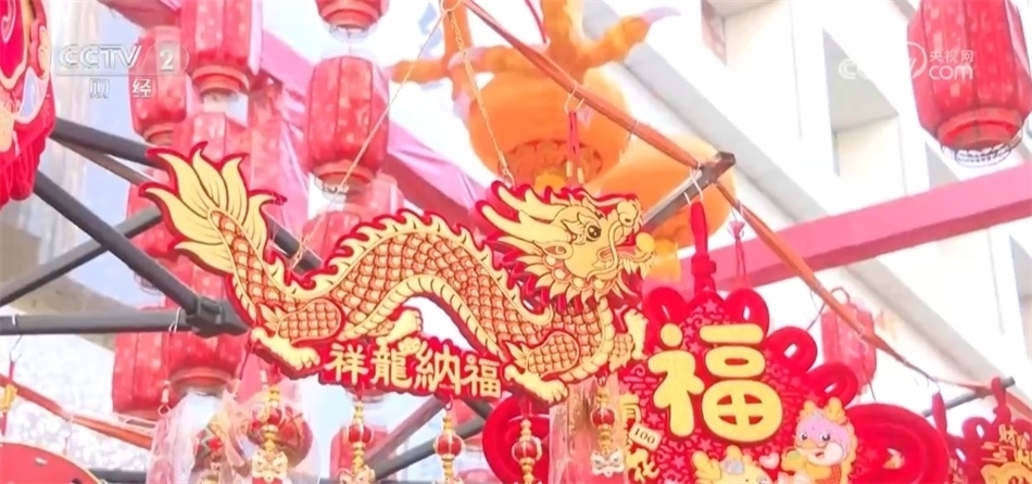 年集現場,不少商家還將帶有龍元素的新年小物件擺放在醒目位置,包括福字貼、紅燈籠、龍玩偶、新年擺件等,無數個紅彤彤的小掛件營造出濃厚的新年氛圍,吸引不少市民購買。