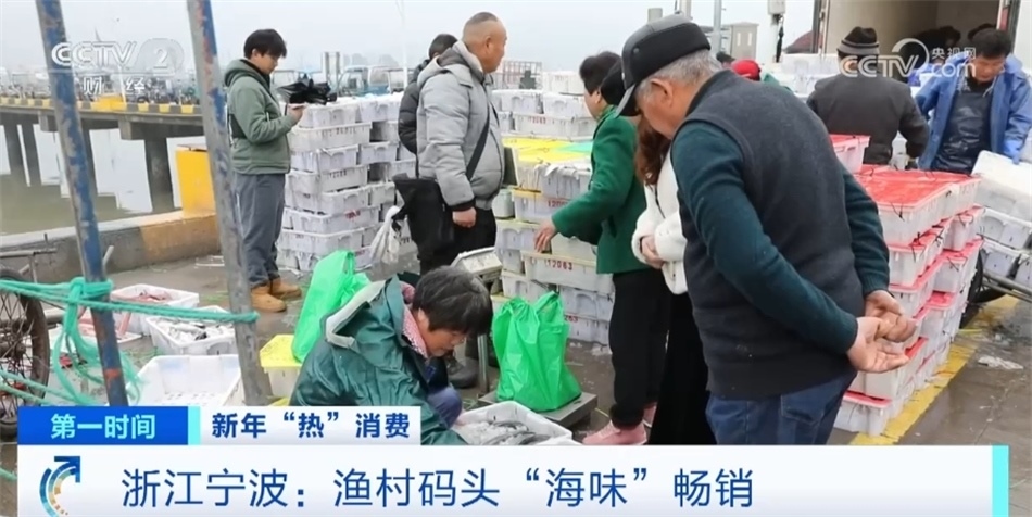 浙江寧波奉化區(qū)莼湖街道的漁村碼頭也進入了年前最后的繁忙時刻。上午八點,5艘運輸船停靠在內外碼頭上,據了解,一艘運輸船有七八千箱漁獲物,近八成是帶魚。最近每天有百萬斤東海魚貨就地銷售或運往全國各地,預計將持續(xù)至臘月二十七。在碼頭邊桐照魚市場的攤位上,色澤鮮亮的帶魚、鯧魚、大黃魚等海產品琳瑯滿目,市民們忙著挑選,漁商們則賣力吆喝著。