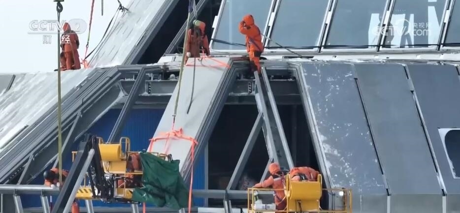 800多斤的幕墻板在大風(fēng)的作用下,就像飄在空中的樹(shù)葉,非常難以控制。此時(shí),現(xiàn)場(chǎng)的風(fēng)力已經(jīng)增加到了8級(jí),氣溫驟降。40分鐘之后,在現(xiàn)場(chǎng)所有隊(duì)員的配合下,第一塊板終于穩(wěn)穩(wěn)的就位了。緊接著是第二塊、第三塊。盡管已經(jīng)在風(fēng)雪中奮戰(zhàn)了十幾個(gè)小時(shí),但大家的臉上依然掛滿了微笑。凌晨12點(diǎn)半,最后一塊板終于順利安裝到位,新站迎風(fēng)面實(shí)現(xiàn)了全封閉,大家也終于放心了。
