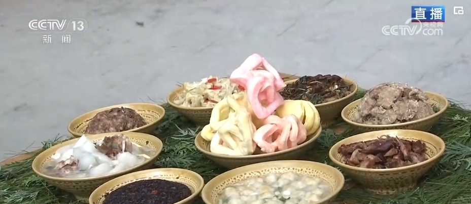 傳統(tǒng)“八大碗”,葷素搭配、香味撲鼻。這個(gè)菜叫做麻脆,是村民們過(guò)年的時(shí)候一定要吃上的美味。麻脆由糯米制作而成,不僅有不同的顏色,還可以制作成花鳥魚蟲、蔬菜水果等多種圖案。龍年到來(lái),村里還特別用蔬果做了一條中國(guó)龍。