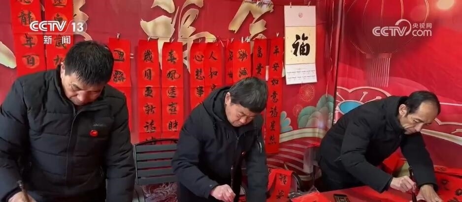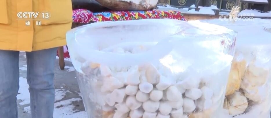 不僅是商品非常有特色,大家來看,這個裝粘豆包的大缸非常結實,晶瑩剔透。它是用水桶為模具,內(nèi)部裝水,在室外凍上一個晚上,脫模后就成了一個天然冰箱,在鄉(xiāng)村,各家年貨、凍貨都可以儲存在這里,整個冬天都沒有問題,既保鮮又節(jié)約空間。大集上,還有對聯(lián)、福字、鄉(xiāng)村土特產(chǎn),充滿濃濃的鄉(xiāng)土氣息。