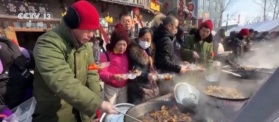 總臺記者 王亞平:我現(xiàn)在就是在長春市蓮花島年貨大集。這會兒大集上香氣撲鼻,每口鐵鍋前都圍滿了品嘗美味的人們。室外冒著寒氣,食客嘴里吐著哈氣,用東北話講,吃得“嘎嘎香”。
