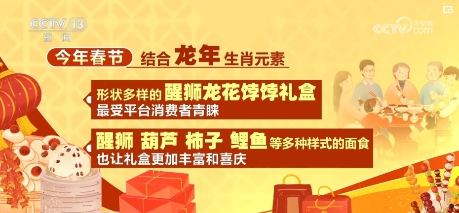 不僅如此,2024年春節(jié),結(jié)合龍年生肖元素,形狀多樣的醒獅龍花餑餑禮盒最受平臺消費者青睞。而醒獅、葫蘆、柿子、鯉魚等多種樣式的面食,也讓禮盒更加豐富和喜慶。