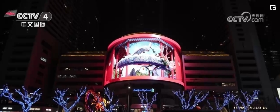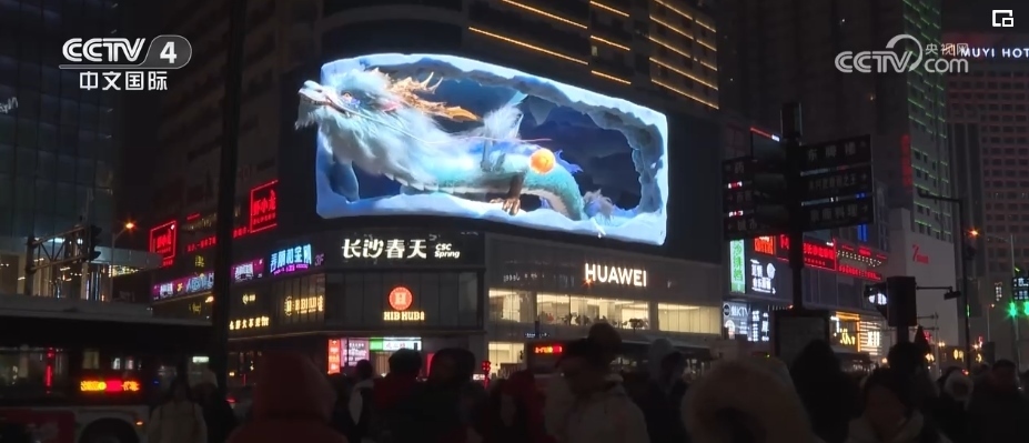 隨著夜幕降臨,在上海市南京西路這家商場(chǎng)戶外大屏,在裸眼3D技術(shù)的加持下,一條靈動(dòng)時(shí)尚的“光影巨龍”騰飛而出。同時(shí),上海南京西路商圈的多個(gè)地標(biāo)建筑,也開(kāi)啟了春節(jié)燈光演繹。