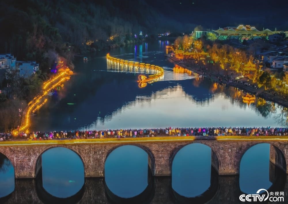 2024年2月12日,安徽黃山齊云山景區(qū),一條由幾十艘竹筏組成百米“金色巨龍”在橫江江面上游弋而過(guò),構(gòu)成一幅震撼的金龍巡游畫卷。