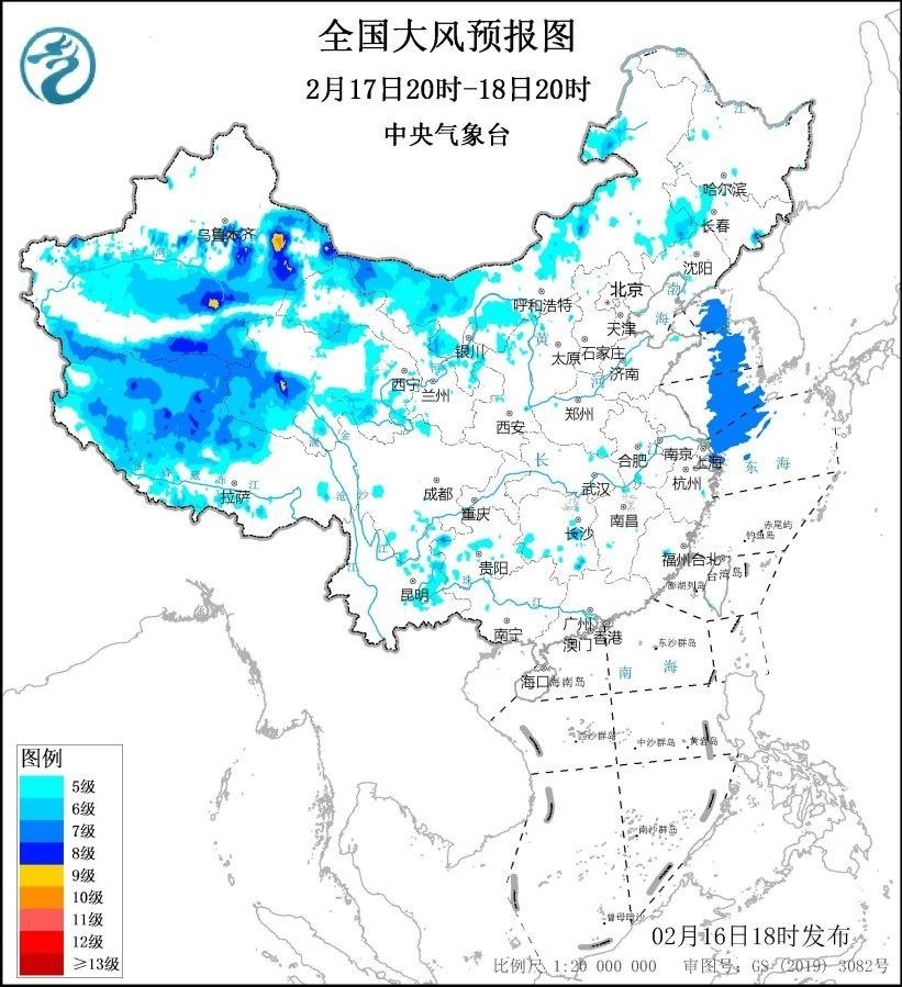 2月17日20時至18日20時,新疆北疆東部和南疆盆地、內蒙古西部、青海西南部、西藏西部、甘肅西部等地將有5~7級、陣風8~9級的大風,新疆山口地區(qū)風力可達10級,陣風12~13級;黃海大部海域、東海北部海域將有7級、陣風8~9級的大風。