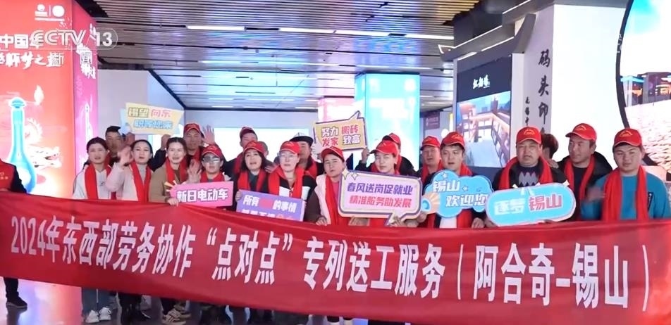 在江蘇無錫,用工企業(yè)早早來到火車站口,迎接首批新疆務(wù)工人員的到來?!包c(diǎn)對(duì)點(diǎn)”大巴車將員工直接送到企業(yè)門口。