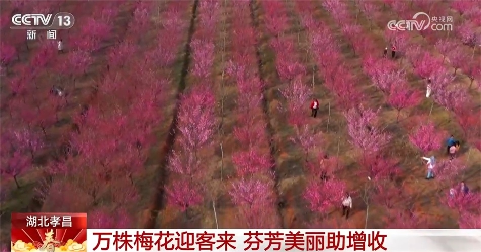 在湖北孝感孝昌縣鄒崗鎮(zhèn),萬株梅花也競相綻放,吸引了眾多市民游客來此“尋梅”。走進梅園,一簇簇梅花綴滿枝頭,蜜蜂飛舞其間,市民游客漫步在花海中,拍照記錄美好風景。