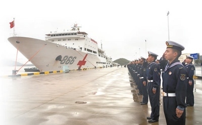 執(zhí)行“和諧使命—2022”任務(wù)的中國(guó)海軍“和平方舟”號(hào)醫(yī)院船返回浙江舟山某軍港,任務(wù)部隊(duì)官兵代表在碼頭迎接。“和平方舟”號(hào)醫(yī)院船是我國(guó)自主設(shè)計(jì)建造的首艘制式遠(yuǎn)洋醫(yī)院船。自2008年入列以來(lái),該船以“和諧使命”任務(wù)為主要載體,多次遠(yuǎn)赴海外開展人道主義醫(yī)療服務(wù)。孫 飛攝(新華社發(fā))