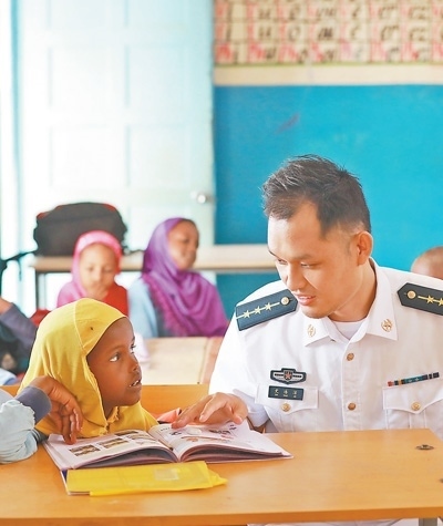 中國(guó)人民解放軍駐吉布提保障基地官兵與吉小學(xué)生交流。中國(guó)軍隊(duì)在吉布提建設(shè)保障基地,是中吉兩國(guó)政府經(jīng)過友好協(xié)商作出的決定,為中國(guó)軍隊(duì)執(zhí)行護(hù)航、維和任務(wù)等提供有力保障。30多年來(lái),我國(guó)已派出維和人員5萬(wàn)余人次,赴20多個(gè)國(guó)家和地區(qū)參加聯(lián)合國(guó)維和行動(dòng)。王宗洋攝(影像中國(guó))