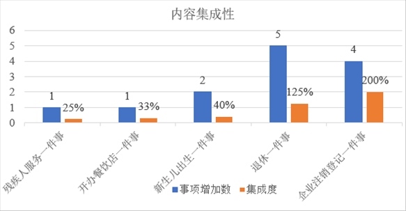 從內容集成度看,5項相關“一件事”的事項集成比例均有不同程度提升?!皻埣踩朔找患隆痹黾?個事項,集成度提升25%?!伴_辦餐飲店一件事”增加1個事項,集成度提升33%。“新生兒出生一件事”增加2個事項,集成度提升40%?!巴诵菀患隆痹黾?個事項,集成度提升125%?!捌髽I(yè)注銷登記一件事”增加4個事項,集成度提升200%。