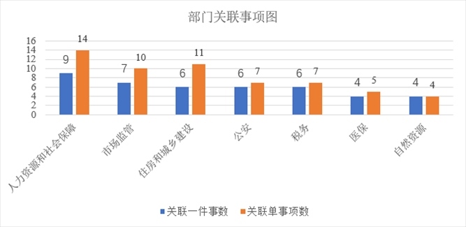 此次新推出第一批13個重點事項清單,涉及人力資源社會保障、市場監(jiān)管局、住房城鄉(xiāng)建設等10個牽頭部門,以及27個責任部門和水電氣網(wǎng)等相關單位。其中,人力資源和社會保障部門關聯(lián)9個“一件事”中14個事項;市場監(jiān)管部門關聯(lián)7個“一件事”中10個事項;住房和城鄉(xiāng)建設部門關聯(lián)6個“一件事”中11個事項;公安部門關聯(lián)6個“一件事”中7個事項;稅務部門關聯(lián)4個“一件事”中6個事項;醫(yī)保部門關聯(lián)4個“一件事”中5個事項;自然資源部門關聯(lián)4個“一件事”中4個事項。