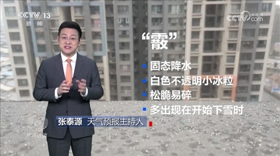 天氣預(yù)報(bào)主持人張?zhí)┰矗骸啊薄且环N固態(tài)降水,由白色不透明的小冰粒組成,近似球形,有時(shí)呈圓錐形,有雪狀結(jié)構(gòu),通常在地面氣溫不太冷時(shí)降落,在剛開始下雪的時(shí)候出現(xiàn)?!?/p>