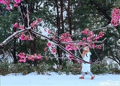 武漢大學早櫻雪中綻放,吸引眾人打卡拍照。
