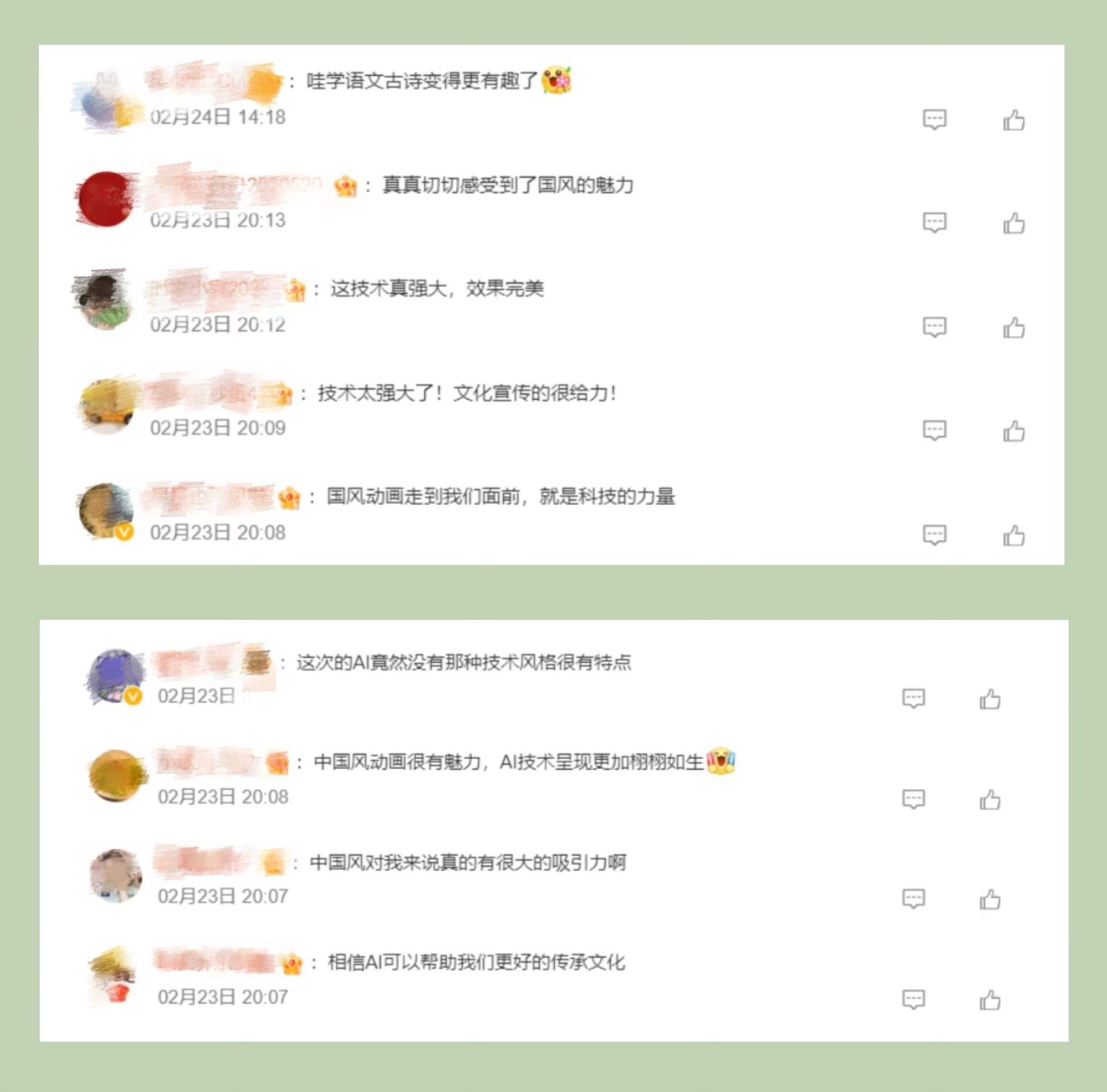 節(jié)目探索詩畫融通的國風動畫片新呈現(xiàn),讓廣大青少年進一步加深了對中國經(jīng)典詩詞的理解和喜愛?!癆I”“總臺”“千秋詩頌”等成為網(wǎng)友熱議高頻詞。截至2月27日20:00,話題#千秋詩頌#閱讀量超791萬次。網(wǎng)友紛紛留言:“看到這個系列片,我真的深深感受到了中國傳統(tǒng)文化的深厚底蘊。這些古詩詞深入骨髓,流淌在我們的血液中,是我們國家的文化符號”“以AI為媒,央視制作的這部國風動畫片傳承了經(jīng)典,喚醒了古韻的新生命”“唯美的畫面讓人動容,用視覺的形式了解《別董大》這一首古老的詩歌更別有一番韻味”“這種科技與動畫片的結(jié)合,恰好是現(xiàn)在小朋友們和大朋友們所需要的”。
