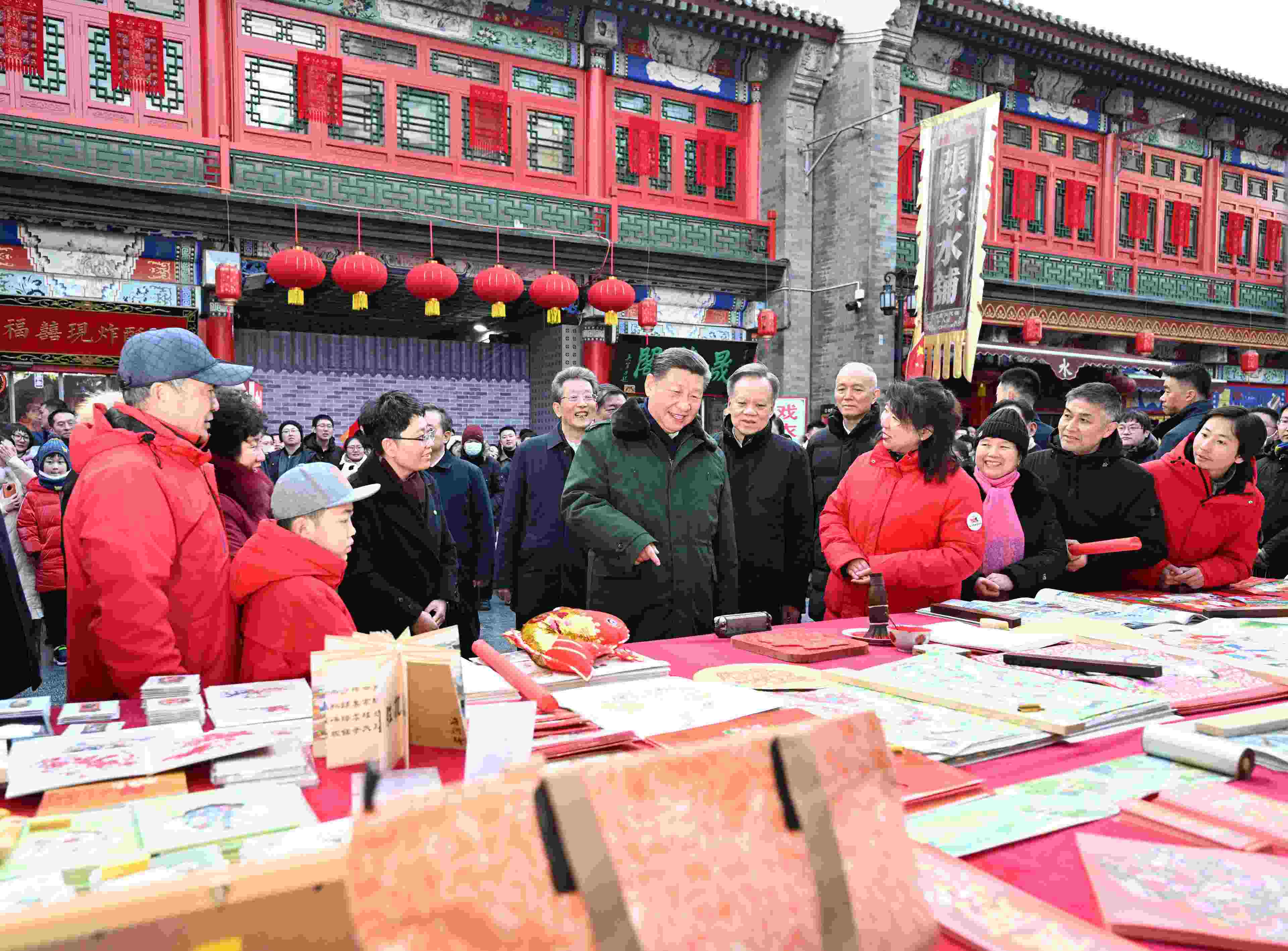△ 2024年2月1日,習(xí)近平總書記在天津古文化街考察時(shí),同店鋪員工和現(xiàn)場(chǎng)群眾互動(dòng)交流。