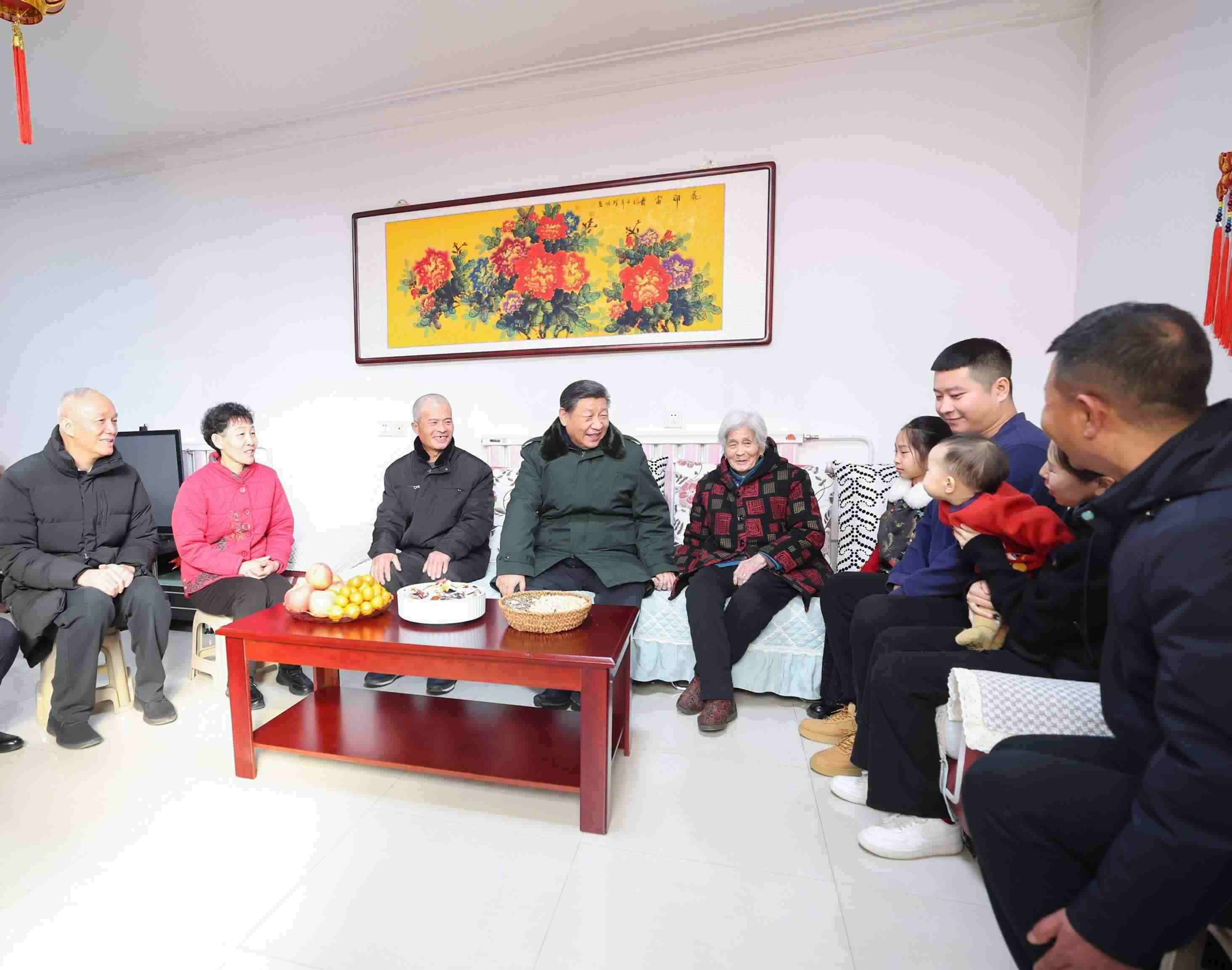 △ 2024年2月1日,習(xí)近平總書記在天津市西青區(qū)辛口鎮(zhèn)第六埠村考察時(shí),同村民杜洪剛一家人親切拉家常。