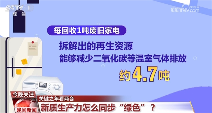 數(shù)據(jù)顯示,2023年,冰箱、洗衣機(jī)、空調(diào)等主要品類家電保有量超過30億臺,一些家電使用了十多年、二十年,更新?lián)Q代的需求和潛力很大。據(jù)統(tǒng)計(jì),2023年,我國廢舊家電回收總量達(dá)450萬噸,而每回收1噸廢舊家電,拆解出的再生資源能夠減少二氧化碳等溫室氣體排放約4.7噸。