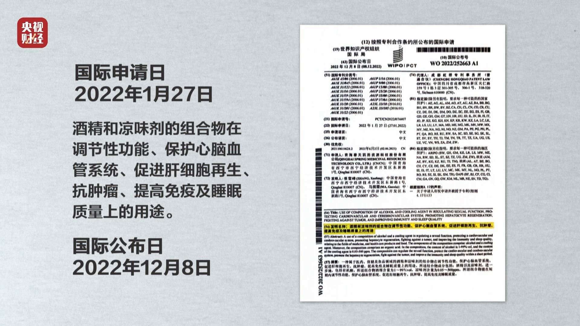 聽花酒申請的專利到底是什么?根據(jù)聽花酒公開資料顯示,2022年1月27日,聽花酒申請的國際專利,名稱為《酒精和涼味劑的組合物在調(diào)節(jié)性功能、保護心腦血管系統(tǒng)、促進肝細胞再生、抗腫瘤、提高免疫及睡眠質(zhì)量上的用途》,公布日為2022年12月8日。