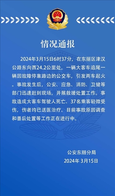 ·天津一輛大客車追尾一輛因故障??柯愤叺墓卉嚕l(fā)兩車起火,事故造成大客車駕駛人死亡、37名乘客輕微受傷。