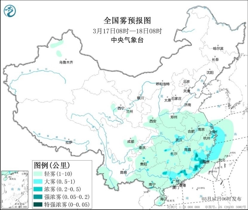 今晨,江蘇、上海、浙江南部、江西中部、福建、廣東、廣西北部、貴州中部等地部分地區(qū)出現(xiàn)大霧天氣,局地能見度不足200米。預(yù)計今天上午,上述地區(qū)的大霧天氣還將持續(xù),局地有能見度不足200米的強濃霧。此外,黃海南部海域、東海偏西海域、臺灣海峽將有能見度不足10公里的霧,其中東海西部海域、長江口附近海域、杭州灣附近海域、浙江沿岸海域、福建北部沿岸海域?qū)⒂心芤姸炔蛔?公里的大霧。中央氣象臺今晨繼續(xù)發(fā)布大霧黃色預(yù)警。