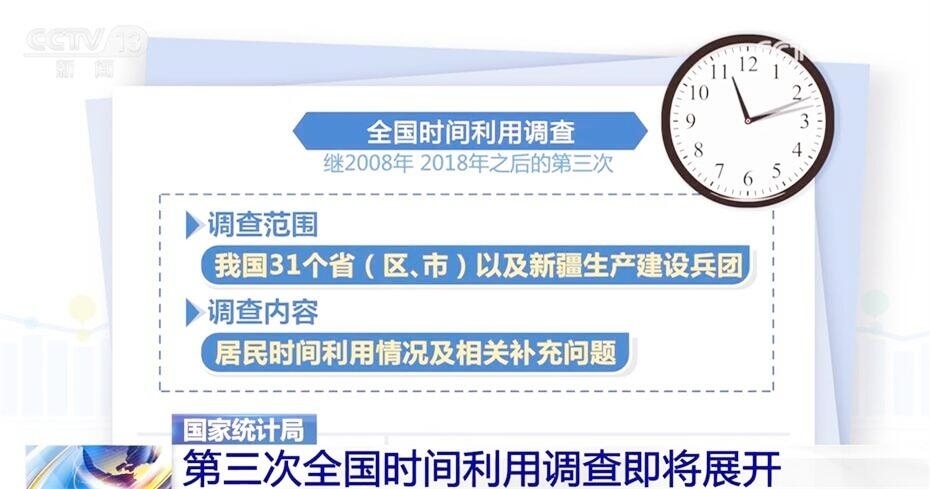 此次全國時間利用調(diào)查是繼2008年、2018年之后的第三次,調(diào)查范圍包括我國31個?。▍^(qū)、市)以及新疆生產(chǎn)建設(shè)兵團,調(diào)查的內(nèi)容為居民時間利用情況及相關(guān)補充問題。