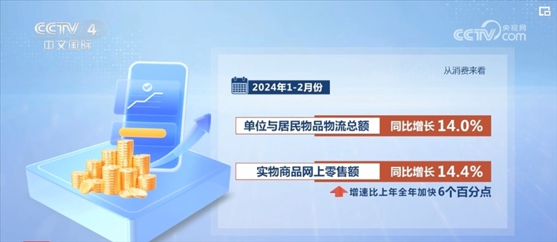 從消費(fèi)來(lái)看,1—2月份,單位與居民物品物流總額同比增長(zhǎng)14.0%,實(shí)物商品網(wǎng)上零售額同比增長(zhǎng)14.4%,增速比上年全年加快6個(gè)百分點(diǎn);快遞業(yè)務(wù)量超過(guò)230億件,同比增長(zhǎng)28.5%,比上年全年加快9.1個(gè)百分點(diǎn)。