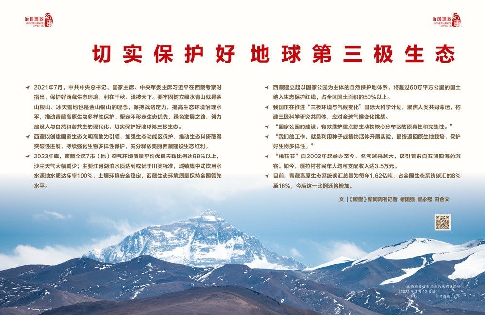 ◇2021年7月,中共中央總書記、國家主席、中央軍委主席習(xí)近平在西藏考察時指出,保護(hù)好西藏生態(tài)環(huán)境,利在千秋、澤被天下。要牢固樹立綠水青山就是金山銀山、冰天雪地也是金山銀山的理念,保持戰(zhàn)略定力,提高生態(tài)環(huán)境治理水平,推動青藏高原生物多樣性保護(hù),堅定不移走生態(tài)優(yōu)先、綠色發(fā)展之路,努力建設(shè)人與自然和諧共生的現(xiàn)代化,切實保護(hù)好地球第三極生態(tài)。