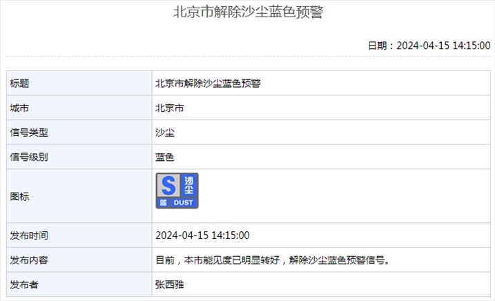 4月15日14時(shí)15分,北京市解除沙塵藍(lán)色預(yù)警:目前,本市能見(jiàn)度已明顯轉(zhuǎn)好,解除沙塵藍(lán)色預(yù)警信號(hào)。