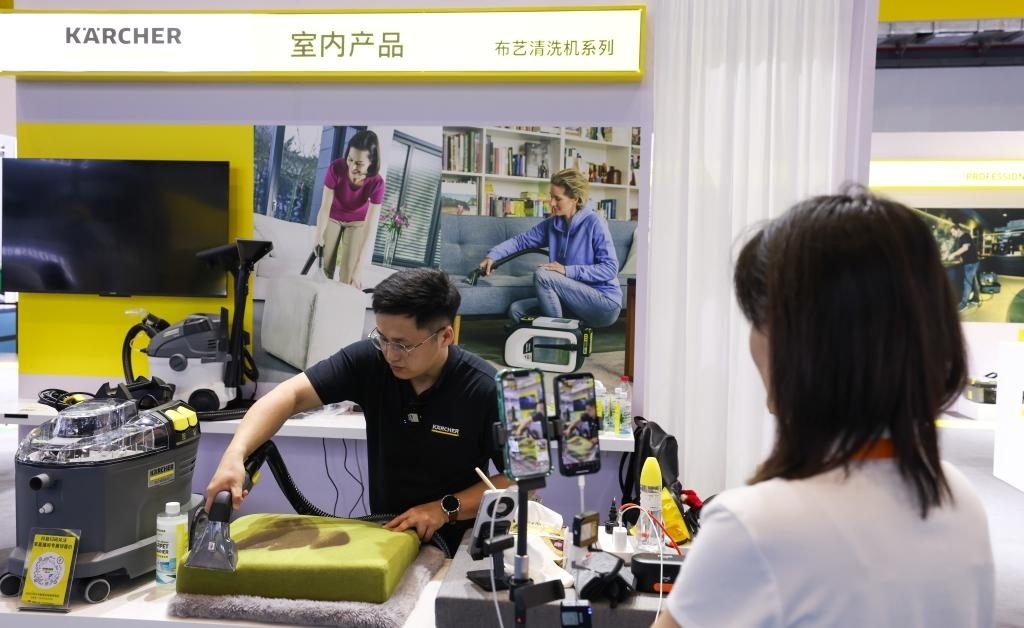 “友友們,現(xiàn)在進(jìn)入‘云’逛消博會時間,大家可以通過直播試擦,感受這款鏡面清潔機(jī)的功能?!币贿呍谡古_發(fā)布新品,一邊引導(dǎo)消費(fèi)者進(jìn)入直播間購買,卡赫現(xiàn)場工作人員陳女士忙得不亦樂乎。據(jù)她介紹,這是公司第一次在消博會上使用直播帶貨形式,“效果不錯,剛剛就有不少粉絲下單”。