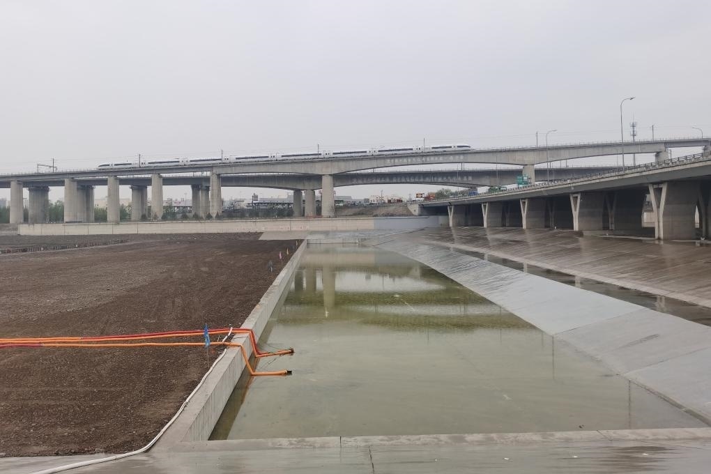 永定河京港澳高速公路大橋南,大寧調(diào)蓄水庫水毀修復(fù)工程施工現(xiàn)場,記者看到,新建的消力池已經(jīng)建好,所有實(shí)體工程已經(jīng)完工,一些工人正在做收尾清理工作。