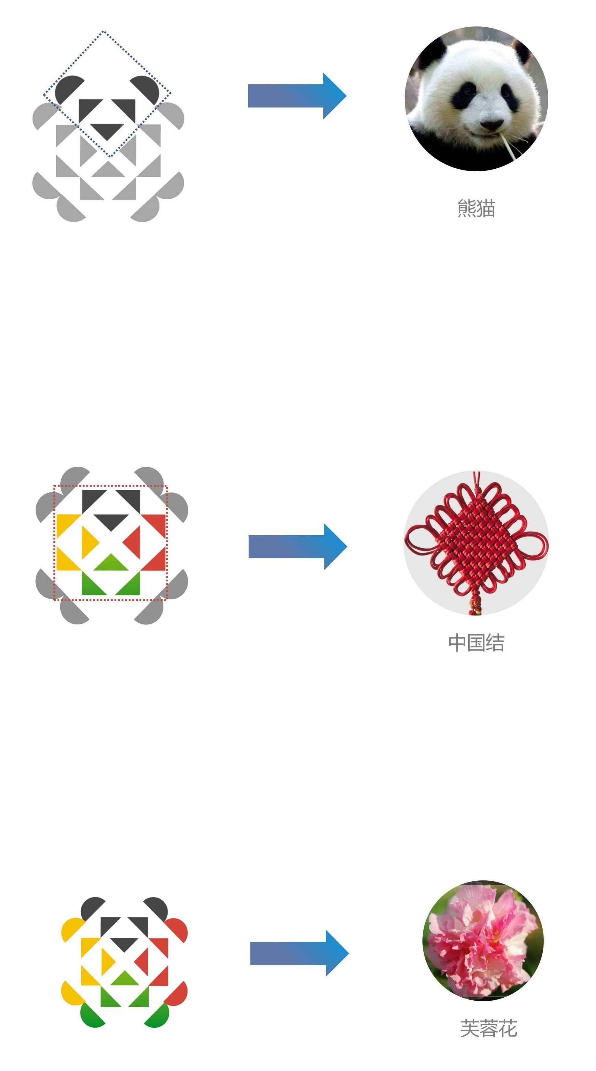 會(huì)徽設(shè)計(jì)靈感源于中國的大熊貓、芙蓉花和中國結(jié),以中國紅、金沙黃、公園綠、熊貓黑、雪山白為主色調(diào)。作為 2025 年成都世界運(yùn)動(dòng)會(huì)的重要標(biāo)志,這一會(huì)徽有效傳達(dá)了奧林匹克精神又凸顯了中國傳統(tǒng)元素和成都特色,彰顯了“團(tuán)結(jié)、包容、多樣性”的價(jià)值觀。同時(shí),設(shè)計(jì)師秉承色彩明快、造型簡(jiǎn)潔的設(shè)計(jì)理念,其外圍的半圓圖案和內(nèi)部排列的三角形,圍成一朵盛開的芙蓉花;紅、黑、黃、綠、白的幾何色塊拼出可愛的卡通大熊貓。