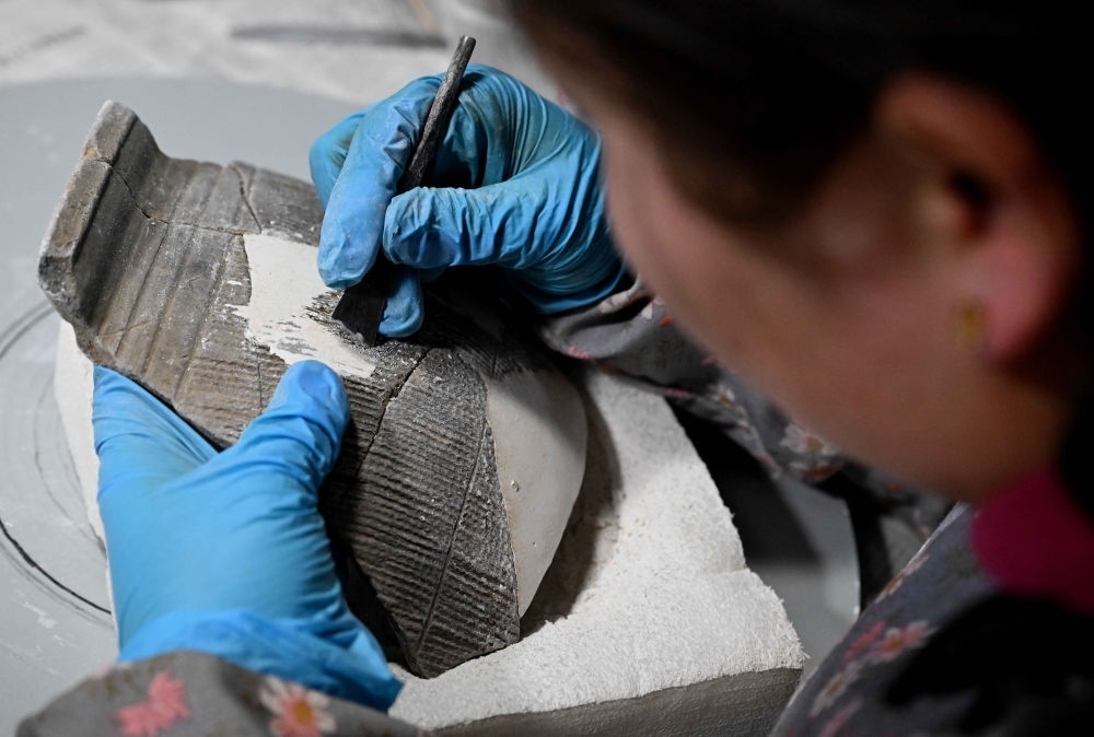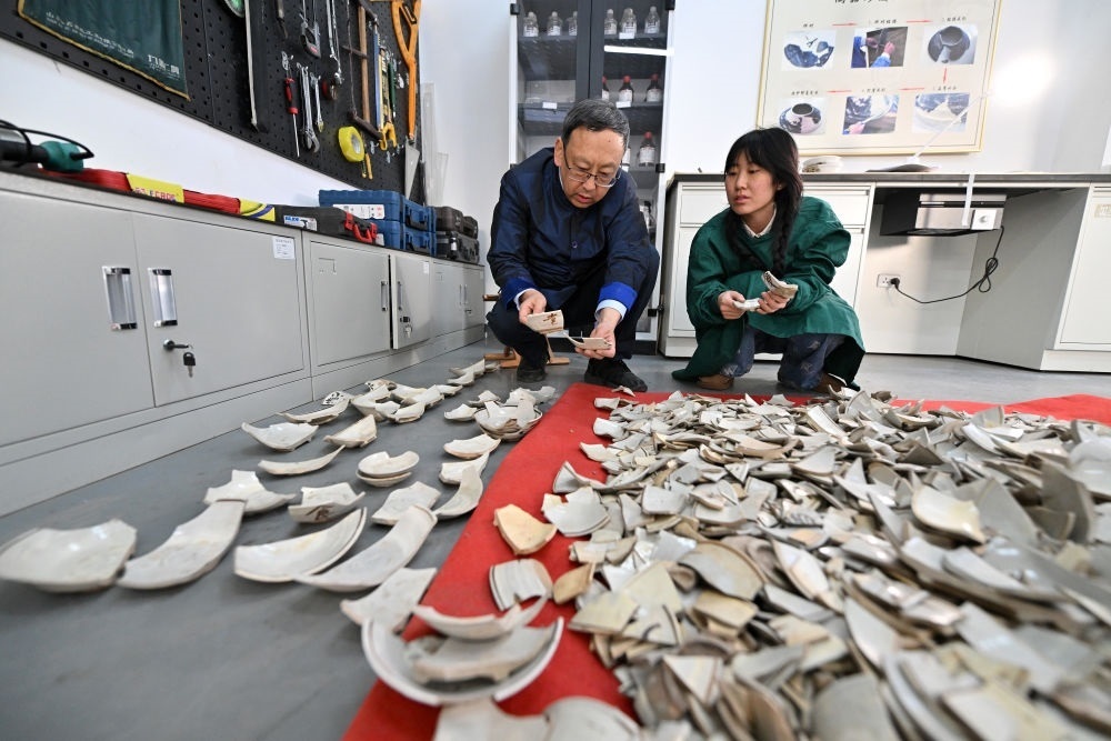 2024年2月23日,在中國社會科學(xué)院考古研究所安陽工作站,工作人員在整理修復(fù)殷墟洹北商城出土的陶片。