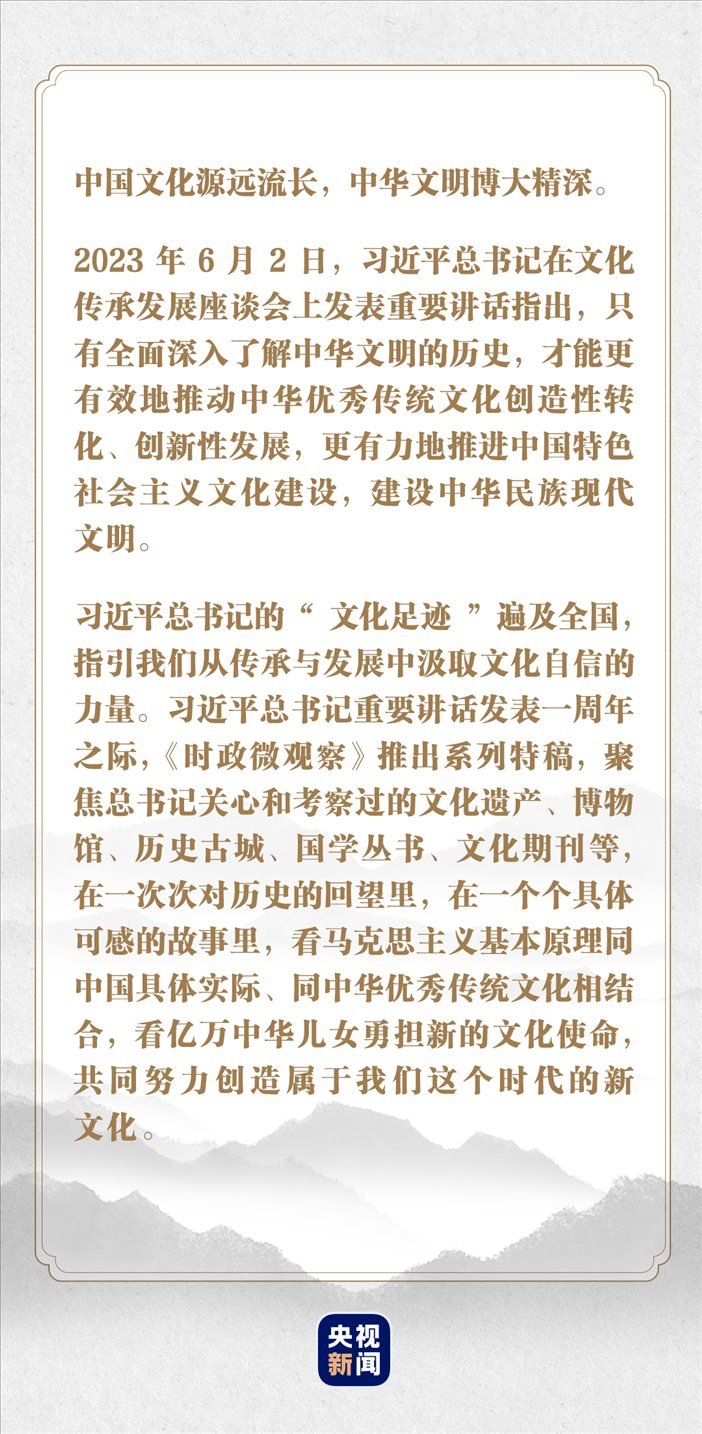 “這段時(shí)間,我一直在思考推進(jìn)中國(guó)特色社會(huì)主義文化建設(shè)、建設(shè)中華民族現(xiàn)代文明這個(gè)重大問(wèn)題?!?023年6月2日,在文化傳承發(fā)展座談會(huì)上,習(xí)近平總書(shū)記指出,“只有全面深入了解中華文明的歷史,才能更有效地推動(dòng)中華優(yōu)秀傳統(tǒng)文化創(chuàng)造性轉(zhuǎn)化、創(chuàng)新性發(fā)展,更有力地推進(jìn)中國(guó)特色社會(huì)主義文化建設(shè),建設(shè)中華民族現(xiàn)代文明。”
