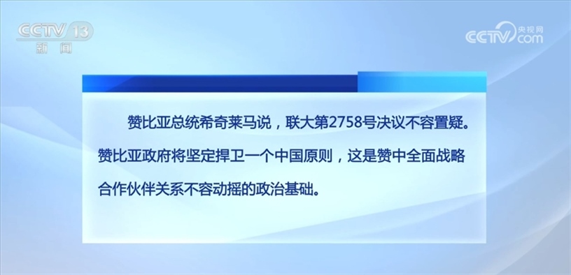贊比亞總統(tǒng)希奇萊馬說,聯(lián)大第2758號(hào)決議不容置疑。贊比亞政府將堅(jiān)定捍衛(wèi)一個(gè)中國(guó)原則,這是贊中全面戰(zhàn)略合作伙伴關(guān)系不容動(dòng)搖的政治基礎(chǔ)。