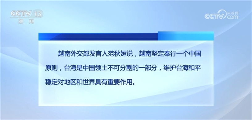 越南外交部發(fā)言人范秋姮說,越南堅(jiān)定奉行一個(gè)中國(guó)原則,臺(tái)灣是中國(guó)領(lǐng)土不可分割的一部分,維護(hù)臺(tái)海和平穩(wěn)定對(duì)地區(qū)和世界具有重要作用。