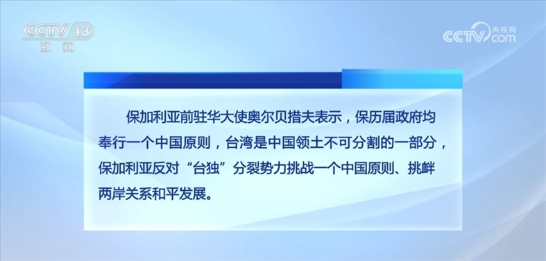 保加利亞前駐華大使奧爾貝措夫表示,保歷屆政府均奉行一個(gè)中國(guó)原則,臺(tái)灣是中國(guó)領(lǐng)土不可分割的一部分,保加利亞反對(duì)“臺(tái)獨(dú)”分裂勢(shì)力挑戰(zhàn)一個(gè)中國(guó)原則、挑釁兩岸關(guān)系和平發(fā)展。