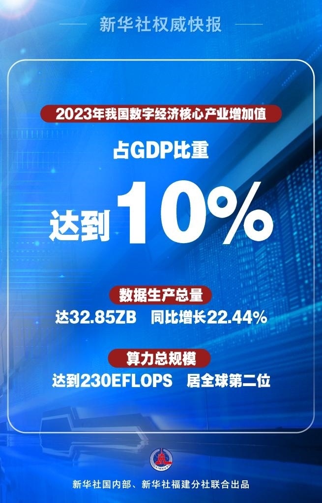 2023年我國數(shù)字經(jīng)濟保持穩(wěn)健增長,數(shù)字經(jīng)濟核心產(chǎn)業(yè)增加值占GDP比重達到10%。數(shù)據(jù)要素市場日趨活躍,2023年數(shù)據(jù)生產(chǎn)總量達32.85ZB(1個ZB等于十萬億億字節(jié)),同比增長22.44%。數(shù)字基礎(chǔ)設施不斷擴容提速,算力總規(guī)模達到230EFLOPS(EFLOPS是指每秒百億億次浮點運算次數(shù)),居全球第二位。