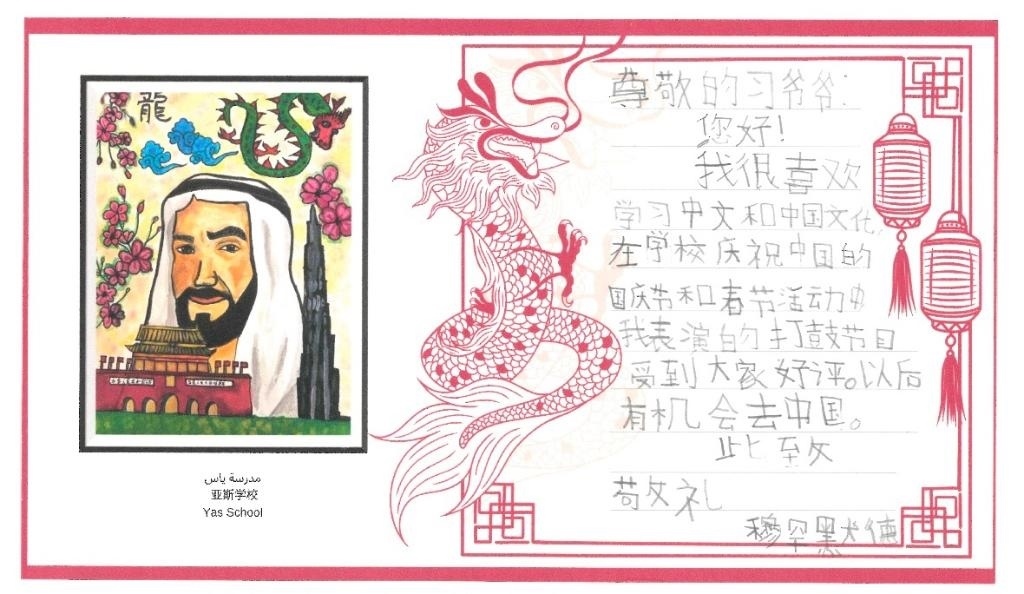 中文名叫“朱婉兒”的12年級學生朱韋雷婭在信中畫下龍與長城,她說如今學中文的阿聯(lián)酋學生越來越多,“相信中阿友好關(guān)系將會更加緊密”。