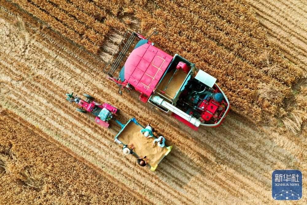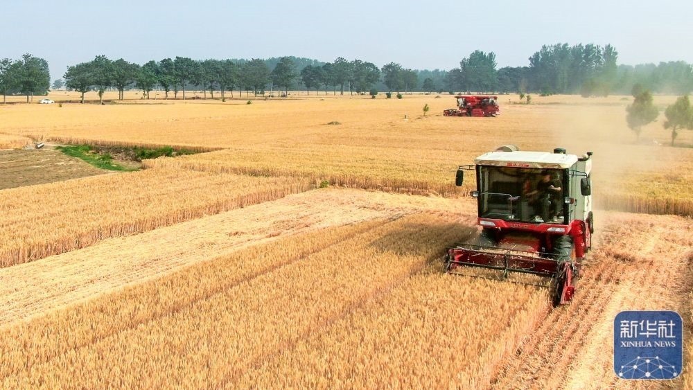 5月26日,在河南省商丘市睢縣尚屯鎮(zhèn)荒莊村,農(nóng)民駕駛收割機(jī)搶收小麥。新華社發(fā)(徐澤源攝)